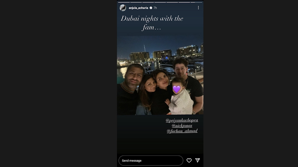 Priyanka Chopra and Nick Jonas are revelling in the joy of raising their daughter, Malti Marie, who graced their lives in January 2022. Recently, a heartwarming photograph surfaced on social media, capturing Priyanka holding Malti close during a night out in Dubai, with Nick standing by their side. Shared by Priyanka's manager on Instagram Stories, the snapshot exudes happiness as Priyanka shines in a chic black outfit, cradling Malti, who looks adorable in white. With a heart emoji gently concealing Malti's face, the trio and her manager complete a picture-perfect family moment against the stunning backdrop of Dubai's night skyline. Priyanka Chopra and Nick Jonas' Daughter Malti Marie Turns 2! See Adorable Photos From the 'Little Angel's' Elmo-Themed Birthday Celebration.