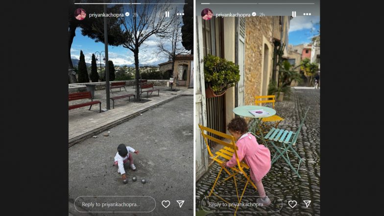 Priyanka Chopra often shares happy pictures of her daughter, Malti Marie, with fans on social media. On Wednesday, April 11, the global star once again delighted fans with cute glimpses of her baby girl on social media. PeeCee took to her Instagram stories to share a couple of pictures of her daughter playing on the streets. In the first image shared, Malti Marie could be seen trying to climb on a yellow chair. The baby girl looked all cute in a pink dress. While in the second picture, the toddler seemed busy with three balls. Last month, Priyanka Chopra, along with her husband, Nick Jonas and daughter Maltie, visited India and enjoyed a memorable time. From taking part in vibrant Holi celebrations to paying a visit to the Ram Mandir in Ayodhya, PeeCee savoured every moment of their stay. Priyanka Chopra Treats Fans With Photo of Daughter Malti Marie Savouring Her Fave Ice Cream.