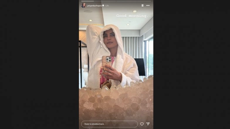 Even with her busy schedule, Bollywood's desi girl Priyanka Chopra enjoys sharing glimpses of her personal life on social media. On May 25, the actress delighted her fans once again, sharing a no-makeup morning selfie. Pretty in a pink night suit, she took to her Instagram stories to wish her followers a 'good morning,' treating them to a radiant selfie, making their day brighter. Priyanka recently wrapped the filming of her upcoming film Heads of State. Priyanka Chopra Shares Adorable ‘Views’ of Hubby Nick Jonas and Daughter Malti Marie Which Are Too Cute To Miss! (See Pic).
