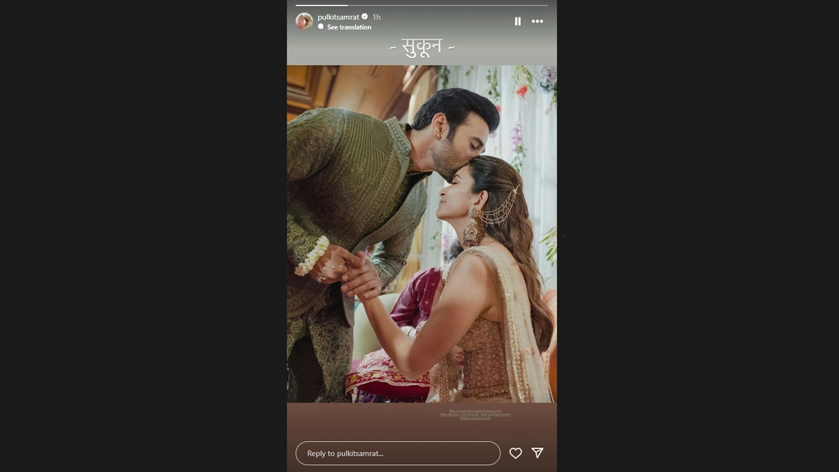 Kriti Kharbanda and Pulkit Samrat tied the knot on March 15, 2024, and have been sharing beautiful photos from their pre-wedding festivities on Instagram. Speaking of that, on Thursday, Pulkit took to his Instagram Stories to share an awwdorable photo with Kriti. The actor can be seen giving a forehead kiss to Kriti in this pic from the mehendi ceremony. He captioned it as, 'Sukoon'. Lovebirds Pulkit Samrat and Kriti Kharbanda Share Colourful Mehendi Celebration Pics.