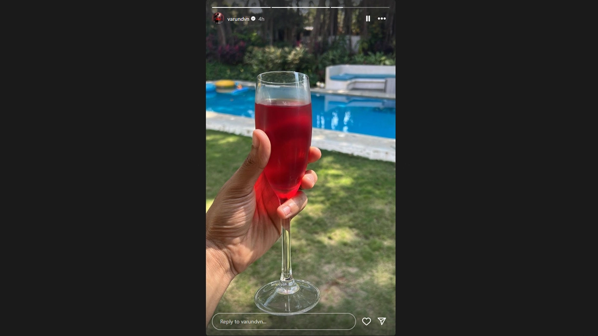 Varun Dhawan and his wife, Natasha Dalal, were recently spotted at Goa airport on Monday, February 19, as they were headed to Rakul Preet Singh and Jackky Bhagnani's wedding venue. Later, Varun gave his followers a sneak peek of their luxurious setting, sharing a picture on Instagram Stories. In the photo, he held a vibrant red-coloured welcome drink by a serene swimming pool, offering a glimpse into the extravagant festivities. Jackky Bhagnani-Rakul Preet Singh Wedding: Couple’s Pre-Wedding Festivities Kickoff With Sundowner Haldi Ceremony in Goa.