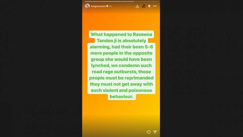 Actress turned-politician Kangana Ranaut came out in support of Raveen Tandon after a video of her getting manhandled on a Mumbai street went viral online. The actress condemned the incident and called it "absolutely alarming". Taking to her Instagram stories, she wrote, "What happened to Raveena Tandon ji is absolutely alarming; had there been 5-6 more people in the opposite group, she would have been lynched. We condemn such road rage outbursts. Those people must be reprimanded. They must not get away with such violent and poisonous behaviour." The Mumbai Police recently confirmed that Raveena's car did not collide with anyone. A viral video on the internet shows a group of people accusing Raveena Tandon and her driver of hitting his mother with their car. Raveena Tandon’s Car Did Not Hit Anyone, Confirms Zonal DCP Amid Actress’s Mob Attack Allegations.