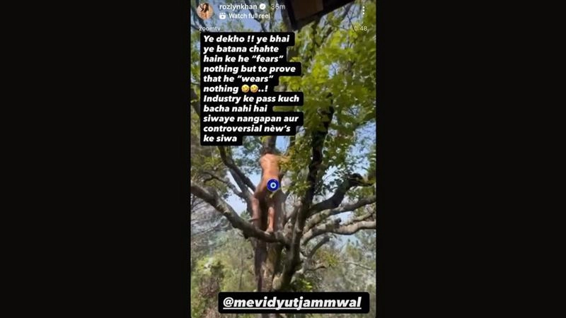 A few days ago, actor and martial artist Vidyut Jammwal left the internet stunned after sharing a video on social media. In the video, he could be seen climbing a tree up and down naked, with his private parts covered by an evil-eye emoji. The actor said that it was part of his training and a way of connecting with nature. The bold video sparked widespread reactions on social media, and now actress and breast cancer awareness activist Rozlyn Khan has also shared her thoughts on it. Taking to her Instagram Stories, she reshared a video of Vidyut and questioned his intent behind the act. She wrote,"Ye dekho! Ye bhai ye batana chahte hai ke he 'fears' nothing but to prove that he 'wears'nothing! Industry ke paas kuch bacha hi nahi hai siwaye nangapan aur controversial news." Vidyut Jammwal Shocks Everyone As He Goes Naked While Climbing a Tree in New Instagram Video; Netizens React – WATCH.