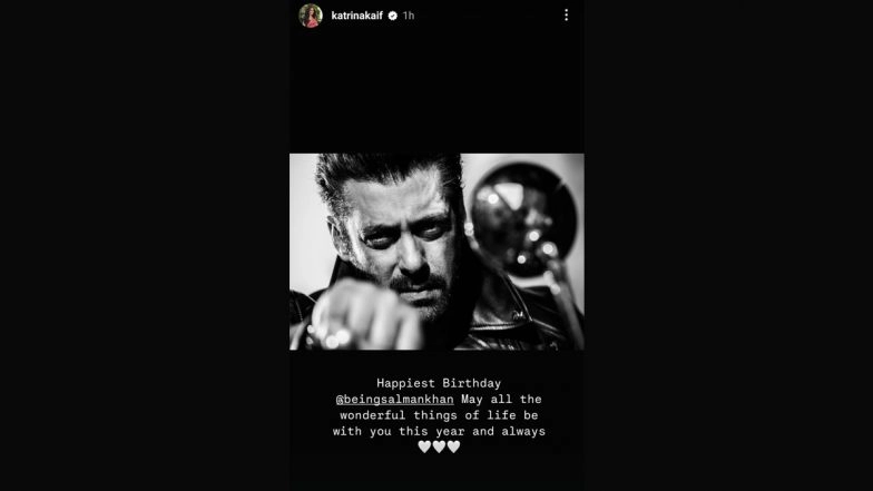 Salman Khan is celebrating his 59th birthday on Friday (December 27). On this special occasion, Katrina Kaif, with whom he has collaborated on multiple projects, shared a heartfelt wish for Bollywood's Bhaihjaan. Taking to her Instagram stories, the Merry Christmas actress shared a monochromatic picture of the actor and wrote, "Happiest Birthday @beingsalmankhanMay all the wonderful things of life be with you this year and always." Katrina Kaif and Salman Khan last shared the screen in YRF's Spy Universe film Tiger 3 in 2023. Salman Khan Turns 59: Bhagyashree Wishes Her ‘First Hero’ on His Birthday, Calls Her ‘Maine Pyar Kiya’ Co-Star ‘The Man That Got the Girls Go Hmmm’ (View Post).
