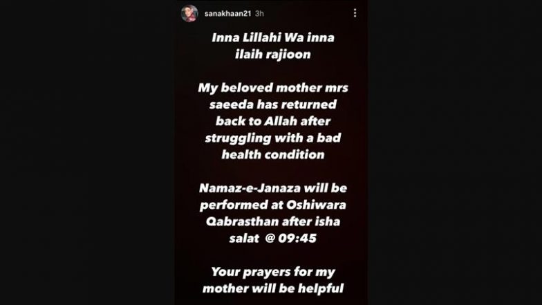 Former actress Sana Khan's mother, Saeeda Khan, has died due to prolonged illness. The Bigg Boss 6 fame took to her Instagram handle on Tuesday (June 24) and informed her fans and followers about the saddening news. She wrote, "Inna Lillahi inna ilaih rajioon. My beloved mother Mrs Saeeda has returned back to Allah after struggling with a bad health condition. Namaz-e-Janaza will be performed at Oshiwara Qabarastan after isha salat at 9:45 PM. Your prayers for my mother would be helpful." Check out her post below. P Madhavan, Malayalam Actress Kavya Madhavan’s Father, Dies at 75 in Chennai.