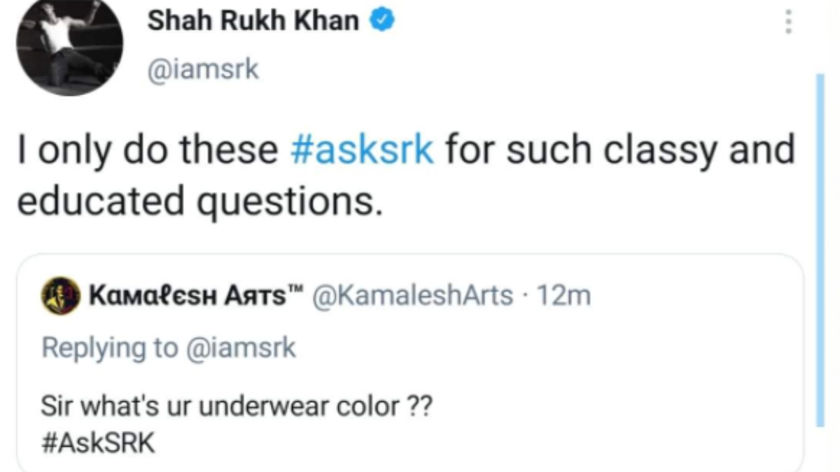 Bollywood superstar Shah Rukh Khan is ruling the internet right now with his #AskSRK session. Amid the same, when a user asked him about the colour of his underwear, the Badshah had the perfect answer to the nasty question. Later on, the Twitter user deleted the tweet. Have a look.