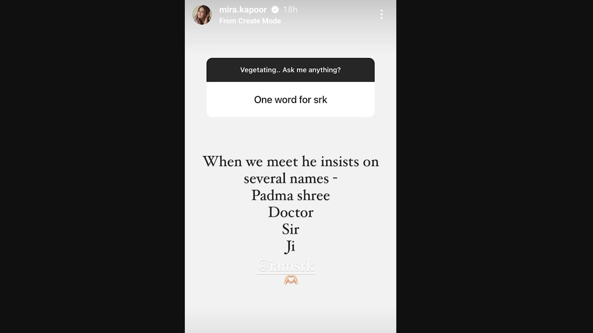 Mira Rajput Kapoor recently invited fans for ‘Ask Me Session’ on her Instagram. When asked to describe the King of Romance, Shah Rukh Khan, in one word, Mira shared a delightful insight. She revealed that whenever they meet the megastar, he playfully insists on being addressed with various titles such as Padma Shree, Doctor, Sir, Ji. Mira shared this amusing tidbit with a heart emoji and tagged SRK in her post. Mira Kapoor Shares Cute Post To Wish Daughter Misha on Her Birthday.