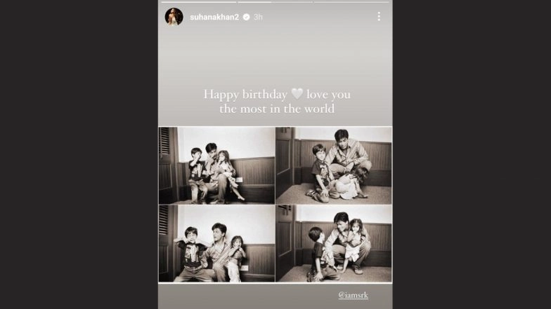 As Shah Rukh Khan turns 59 today, November 2, his daughter Suhana Khan took to social media to celebrate her father's special day with heartfelt wishes. She shared a touching birthday message accompanied by a delightful collage of vintage monochromatic photos, capturing cherished moments of Shah Rukh with his children, Aryan and Suhana. In her Instagram Stories, Suhana expressed her love with a simple yet profound caption: "Happy Birthday. Love you the most in the world.” Alongside this, she also shared a fan-made video, playfully stating that she inherited her beauty from her dad, further emphasising the special bond they share. With joy and warmth, Suhana's tribute perfectly encapsulated the love and admiration she holds for her father on his birthday. Shah Rukh Khan Turns 59: The Academy Shares Iconic ‘Kabhi Khushi Kabhie Gham’ Scene To Celebrate SRK’s Birthday (Watch Video).
