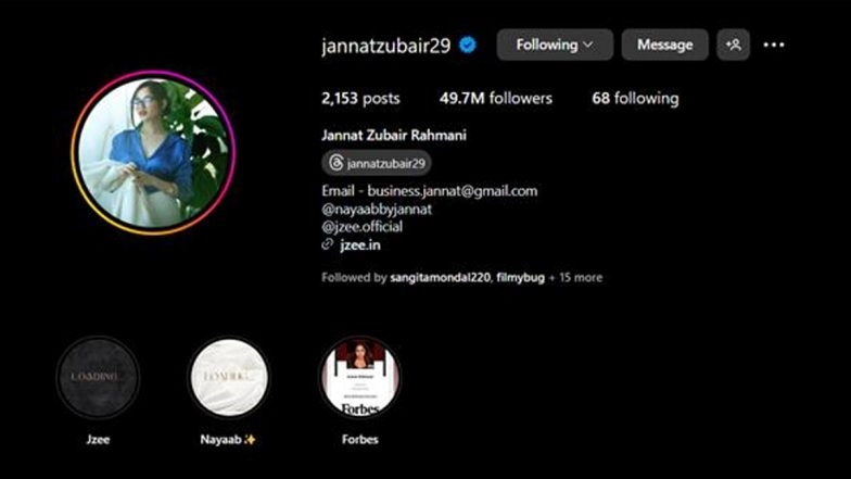 Bollywood actors have long been known for their massive Instagram following, with stars like Shraddha Kapoor and Priyanka Chopra leading the charge. Even the Bollywood Badshah, Shah Rukh Khan, boasts an impressive 47.7 million followers. But here's the twist – there’s a new queen of Instagram in town! You won’t believe it, but it’s none other than Jannat Zubair Rahmani! The actress has now surpassed SRK with a staggering 49.7 million followers – that’s a whole 2 million more! Now, that’s some seriously impressive social media clout. It’s amazing to see how Jannat has carved out her own space and captured the hearts of millions! ‘You Are One in a Billion, My Friend’: Shah Rukh Khan Replies to Chris Martin's Shoutout to Him During Coldplay’s ‘Music of the Spheres’ Mumbai Concert 2025.