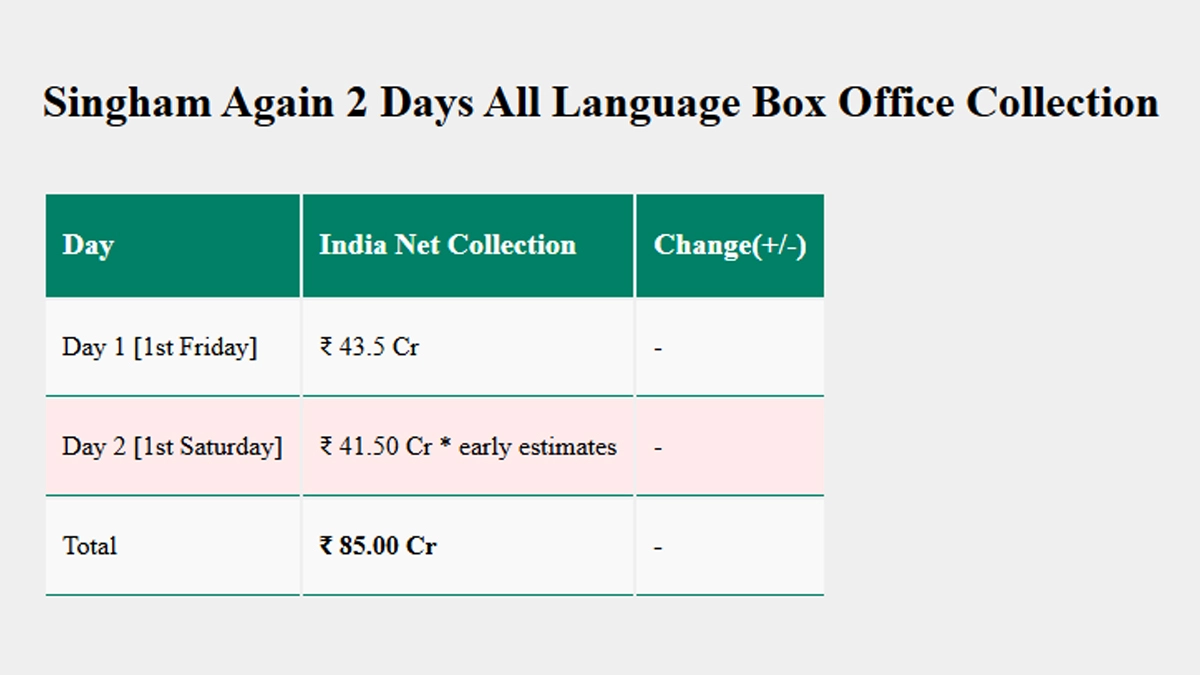Ajay Devgn and Rohit Shetty’s latest cop drama, Singham Again, is off to an incredible start at the box office. After a stellar opening day with INR 43.5 crore, the film continued its strong performance on the second day as well, earning an impressive INR 41.5 crore, according to Sacnilk. This brings the film’s total collection to INR 85 crore in just two days, setting it well on track to hit the INR 100 crore mark in India soon. ‘Singham Again’ Ending Explaned: ‘Mission Chulbul Singham’! Decoding What Salman Khan’s Chulbul Pandey Cameo in Ajay Devgn’s Movie Means for Rohit Shetty Cop Universe! (SPOILER ALERT).