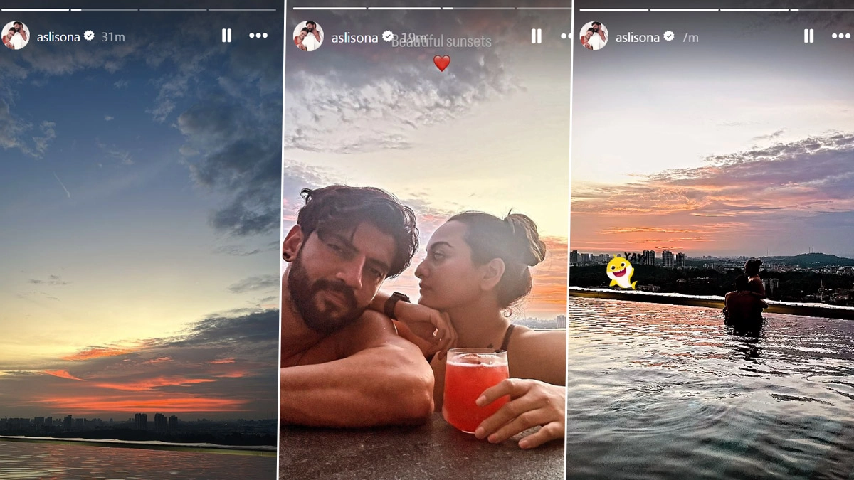 Sonakshi Sinha and Zaheer Iqbal, who recently tied the knot in a private ceremony on June 23, are serving their fans major couple goals! Sonakshi recently took to social media to share a glimpse of their post-wedding romance, sending the internet into a frenzy. The honeymoon photos from undisclosed location radiate pure newlywed bliss. The couple can be seen enjoying quality time together by a pool, surrounded by nature's beauty. One picture even features Zaheer shirtless. Check it out. Luv Sinha Breaks Silence on Skipping Sister Sonakshi Sinha's Wedding to Zaheer Iqbal; Actor Says 'Would Not Associate With Some People' – Find Out Why!