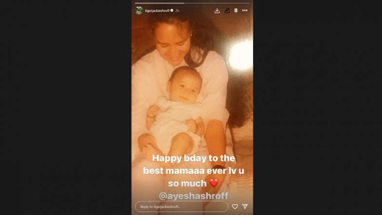 Jackie Shroff and his wife, Ayesha Shroff, are celebrating their 47th wedding anniversary today. The day turns more special as the veteran actor's wife also celebrates her birthday today. On the occasion, heartfelt wishes have been pouring in from all corners. Now, Tiger Shroff has shared an adorable birthday post for his 'mamma'. Taking to his Instagram stories, the Bade Miyan Chote Miyan star shared a cute unseen picture from his childhood. Sharing the photo, he wrote, "Happy birthday to the best mamma ever. Love you so much." 'Love You' Disha Patani Wishes Rumoured Ex Tiger Shroff’s 'Beautiful' Mother Ayesha Shroff on Her Birthday (See Pic).