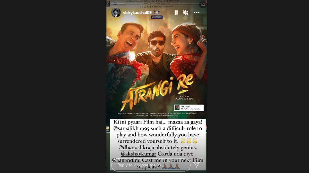 Newlywed Vicky Kaushal is super amazed after watching Sara Ali Khan and Dhanush-starrer Atrangi Re. The URI actor took to Instagram story and heaped praises at the cast as well as the filmmaker, Aanand L Rai. That's not it, as he also urged the filmmaker to cast him in his next. Hahaha! Check it out.