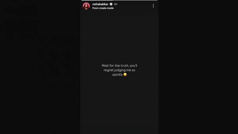 Singer Neha Kakkar recently got embroiled in a major controversy after a viral video from her Melbourne concert suggested that she arrived three hours late. The clips also showed a teary-eyed Neha apologizing to the crowd for the distress caused, but they remained unimpressed with the apology and called it "drama". This led to a major backlash on the internet, with netizens targeting her. Things escalated so much that her brother, Tony Kakkar, had to step in and defend her in a series of posts. Amid the backlash, Neha Kakkar has now shared her first reaction to the incident. Taking to her Instagram stories on Thursday (March 27), the "Kala Chashma" singer wrote, "Wait for the truth, you'll regret judging me so quickly". Check out her post below. Neha Kakkar Breaks Down on Stage at Melbourne Concert After Arriving 3 Hours Late; Angry Crowd Tells Her To ‘Go Back’ in Viral Video – WATCH.