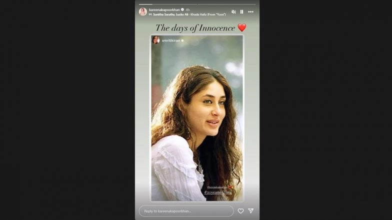 Kareena Kapoor Khan is one of the finest actresses in Bollywood. The industry's 'Bebo' has had her own ups and downs in her illustrious career. On May 21, her film Yuva completed 20 years! Celebrating the occasion, Kareena Kapoor took to her Instagram stories and shared a rare throwback picture of her character in the movie. Sharing the picture, Kareena wrote, "The days of Innocence". The actress looks absolutely stunning in the picture, and we can't stop gushing over it. Directed by Mani Ratnam, Yuva also starred Ajay Devgn, Abhishek Bachchan, Vivek Oberoi, Rani Mukerji and Esha Deol in lead roles. Kareena Kapoor Khan Serves Airport Style Goals; Check Out The Diva's Comfy Summer Fashion Game (Watch Video).