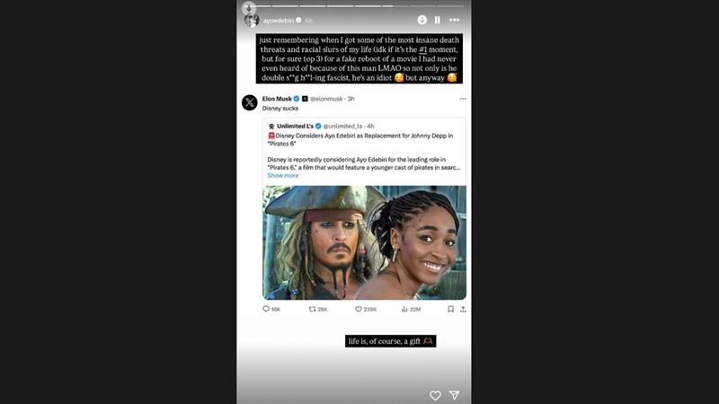 Ayo Edebiri, best known for her role as chef Sydney Adamu in the comedy-drama series The Bear, has slammed Tesla CEO Elon Musk in a recent Instagram Story. She called him out for resharing a fake Pirates 6 casting rumour, which led to her receiving “death threats and racial slurs.” The false report claimed that Disney was considering Edebiri as a replacement for Johnny Depp, prompting Musk to react with a “Disney S**ks” post. Sharing a screenshot of his reaction, Edebiri wrote, “Just remembering when I got some of the most insane death threats and racial slurs of my life (idk if it’s the #1 moment, but for sure top 3) for a fake reboot of a movie I had never even heard of because of this man LMAO,” she wrote. “So not only is he a double s**g h**l-ing fascist, he’s an idiot, but anyway.” ‘Our Child Will Suffer’: Grimes Accuses Ex Elon Musk of Ignoring Their Baby’s ‘Medical Crisis’ in Now-Deleted Posts.