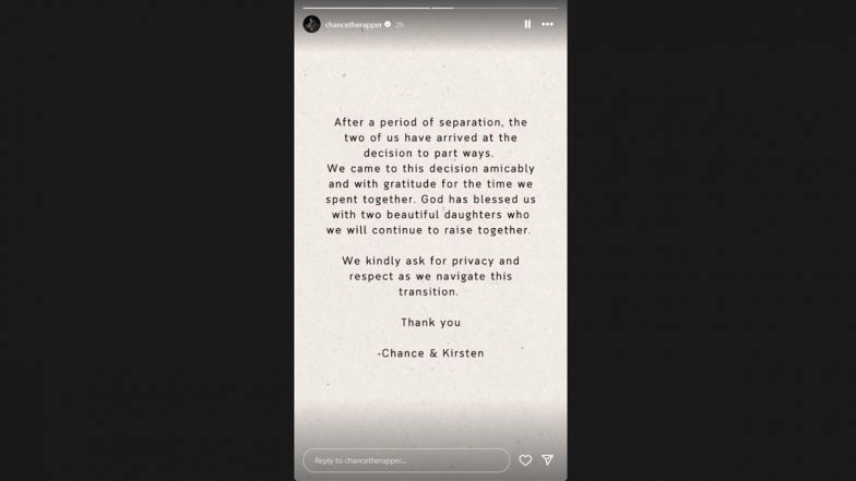 Chance The Rapper and his wife, Kirsten Corley Bennett, announced their divorce on Wednesday, April 3. The couple took to their Instagram account to share a joint statement announcing their split. "After a period of separation, the two of us have arrived at the decision to part ways. We came to this decision amicably and with gratitude for the time we spent together." read their statement. The couple further assured that they will continue to co-parent their daughters Kensli, 7 and Marli, 4. Chance and Kirsten got married in 2019 after dating for several years. Chance the Rapper Marries Kirsten Corley! Here’s the Official First Batch of Their Beautiful Wedding Pictures.