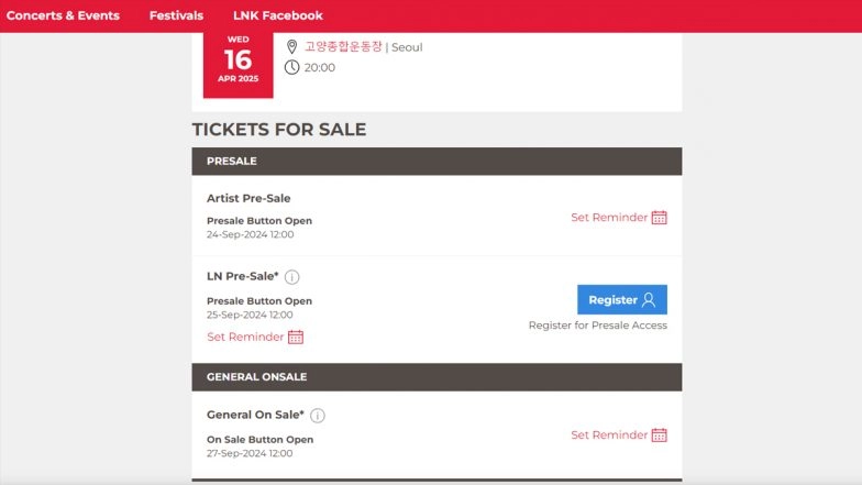 Coldplay is about to light up the stage, and the buzz is electric! This legendary British rock band is making a thrilling comeback to India as part of their ‘Music of the Spheres’ world tour, with stops in Abu Dhabi, Mumbai, Hong Kong, and Seoul from January to April 2025. Save the dates—Seoul will be treated to the Coldplay experience on April 16, 18, 19, and 22 at Goyang Stadium! Now, let’s talk tickets! According to Livenation, they’re not available just yet, but mark your calendars for the presale dates: September 24 and 25, 2024, with general sales kicking off on September 27, 2024. Don’t miss your chance to grab those tickets! On Sale Button Open27-Sep-2024. So, are you ready to soak in the vibes? Grab your tickets before they vanish into thin air! Coldplay Abu Dhabi 2025 Concert Ticket Prices: Know 'Music of the Spheres' World Tour Dates in UAE, Ticket Prices in INR & Other Details Ahead of January Show.