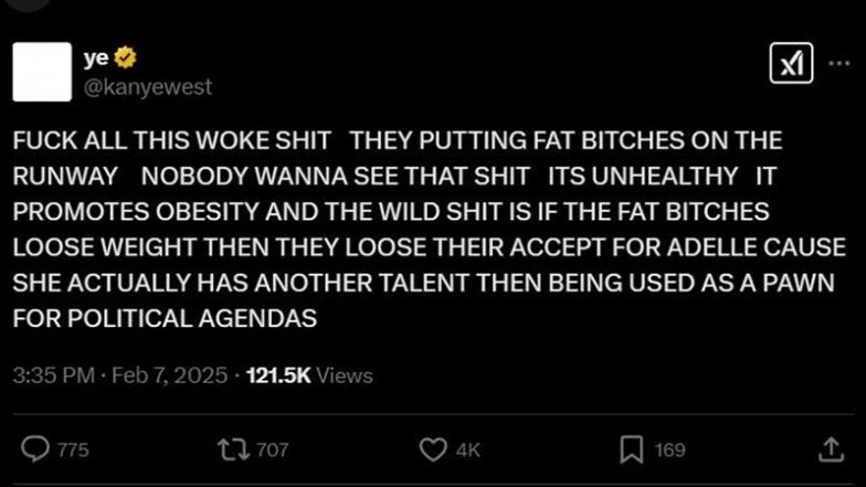 Kanye West aka Ye made headlines again after his and Bianca Censori's bold Grammys after-party appearance, followed by his controversial remarks criticising the fashion industry's embrace of plus-size models. West made headlines following controversial remarks about plus-size models on the runway. In a blunt social media post, he criticised the fashion industry's growing embrace of diverse body types, labelling it as "woke nonsense" that he believes promotes unhealthy lifestyles. He claimed that showcasing "fat women" on the runway normalises obesity rather than addressing health concerns. Kanye argued that if these models lose weight, they often face rejection, except for figures like Adele, whose talent stands independent of political or social agendas. His comments seem to highlight a disdain for what he perceives as performative inclusivity within the fashion and entertainment industries, where, in his view, individuals are tokenised for appearances rather than valued for genuine merit. GRAMMYs 2025: Bianca Censori’s Bold See-Through Ensemble Exposes Her Nude Look, Strikes a Pose With Husband Kanye West (Watch Video).