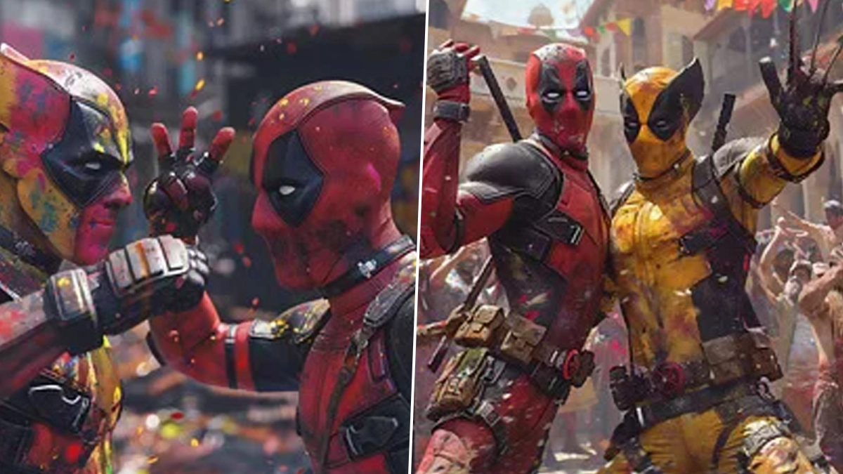 Fans have blended the iconic red of Ryan Reynolds' Deadpool with Hugh Jackman's Wolverine's vibrant yellow in playful AI-generated images playing Holi. These imaginative portrayals showcase the Marvel duo joyously splashing colours on each other amidst the festive fervour. From cheerful chest bumps to playful threats with Wolverine's adamantium claws, the scenes brim with camaraderie and fun. Holi 2024 Songs' Playlist: 5 Bollywood Hindi Songs for a Lively Holi Rain Dance Party (Watch Videos).