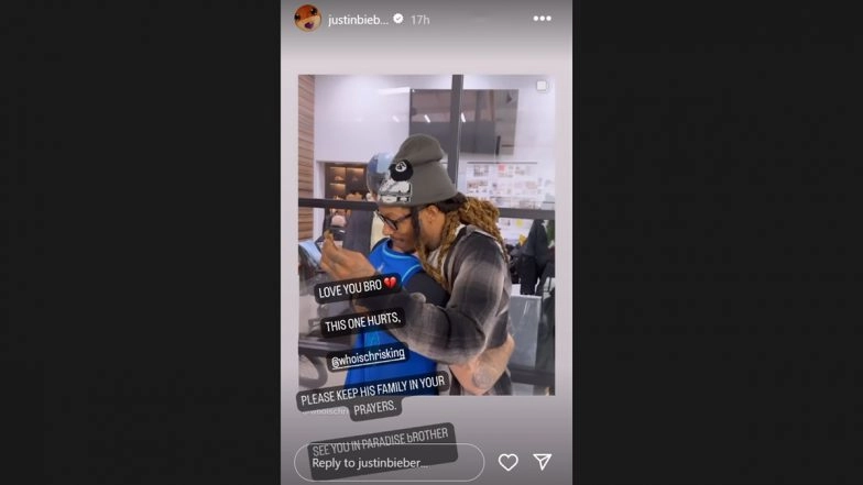 Justin Bieber took to his social media on Saturday, April 20, to pay tribute to his friend and rapper Chris King, who recently passed away. Taking to his Instagram story, the 30-year-old shared a post from December 2023 that captured a warm moment between him and Chris King. Sharing the video, Bieber wrote, "Love you bro. This one hurts. Please keep your family in your prayers. See you in paradise, brother." Rapper Trippie Redd confirmed King's death online. However, details on the circumstances surrounding his death remain unclear. Video of Justin Bieber Kissing Will Smith’s Son Jaden Smith at Coachella 2024 Goes Viral – WATCH.