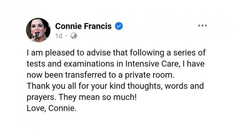 Connie Francis Shares Health Update on Facebook Following Hospitalisation