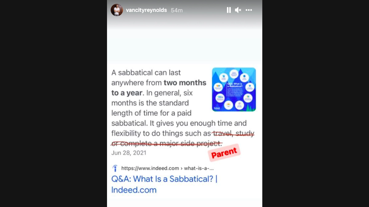 Ryan Reynolds announced that he has taken "a little sabbatical" from films following the wrap on the Apple TV Plus film Spirited. The 44-year-old actor shared the news in an Instagram post on Saturday. He also shared his reason for the break, saying that he wants to focus on parenting.