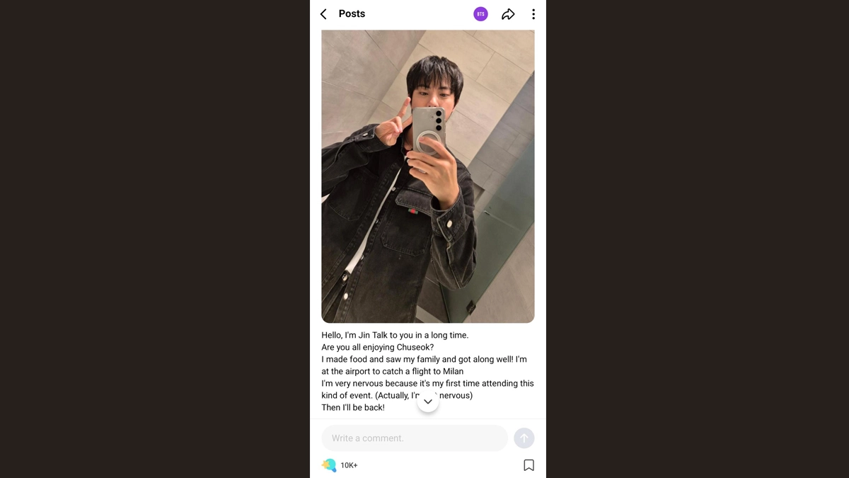 BTS Jin Turns Heads in Black Denim Outfit, Drops Mirror Selfie on Weverse