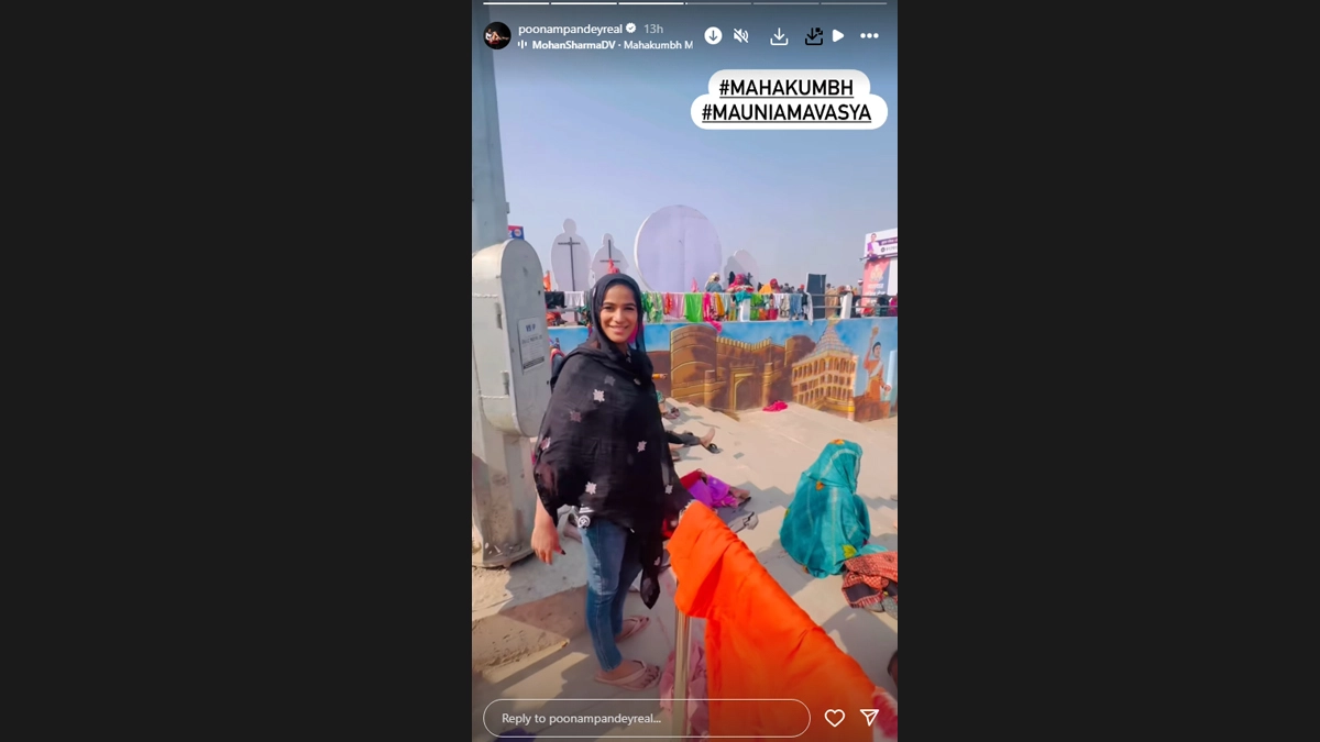 Poonam Pandey took a holy dip at the Maha Kumbh Mela in Prayagraj and shared priceless moments from her spiritual journey on social media. Dressed in a black printed kurta, the controversial actress was seen taking the sacred dip and offering prayers on the auspicious occasion of Mauni Amavasya. In one of the photos, she even wrote, ‘Sab paap dhul gaye mere (All my sins have been washed away).’ Maha Kumbh Mela 2025: Record-Breaking Turnout at Mahakumbh, Over 10.80 Crore Devotees Have Taken Holy Dip So Far at Triveni Sangam in Prayagraj (See Pics).