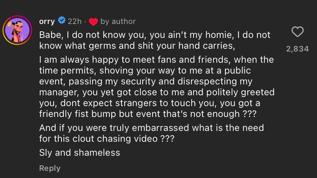 Orry has hit back at an influencer namely, Ruchika Lohiya (_chikka), who claimed that the internet sensation said 'Hi' to her but rejected her handshake at a recent event. Lohiya took to her Insta and shared a video wherein she first lauded Orhan Awatramani for being nice to her but later mentioned how he gave a fist bump when she wanted a handshake. This did not go down well with Orry, and he jumped to her comment section and penned his heart out. He mentioned that he didn’t know her properly and wasn’t aware of what 'germs' and 'shit' she was carrying. Furthermore, Orry even called Ruchika 'sly' and 'shameless'. Orry Reveals He Gets Rs 15 Lakh to 30 Lakh for Attending Weddings, Calls It His 'Primary' Source of Income.