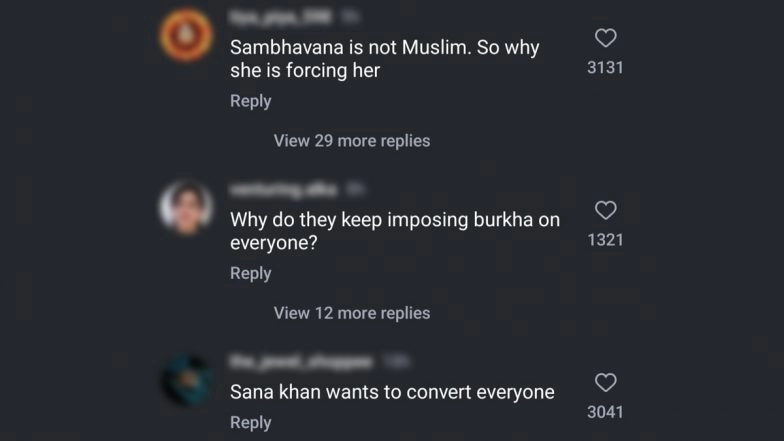Former actress Sana Khan keeps grabbing headlines mostly due to her controversial comments. The Jai Ho actress who left the world of showbiz to embrace spirituality has once again found herself at the centre of a controversy. The Bigg Boss 6 fame is now facing backlash for allegedly pressuring her friend and actress Sambhavna Seth to wear a burkha. In a clip from Sambhavna Seth's latest vlog doing rounds on the internet, Sana Khan was heard telling her, "Tere paas ko acchi salwar kameez nahi hai. Thappad chahiye? Where is your dupatta? Burqa laao. Sambhavna ko bura pehnao." As soon as the video surfaced online, netizens slammed Sana Khan for forcing her religious belief on others. One user wrote, "Sambhavna is not Muslim. Why is she forcing her?" while another commented, " She is Hindu, not Muslim. Respect her". Sana Khan and Anas Saiyad Blessed With Second Child; ‘Happy Parents’ Announce the Birth of Their Baby Boy (Watch Video).