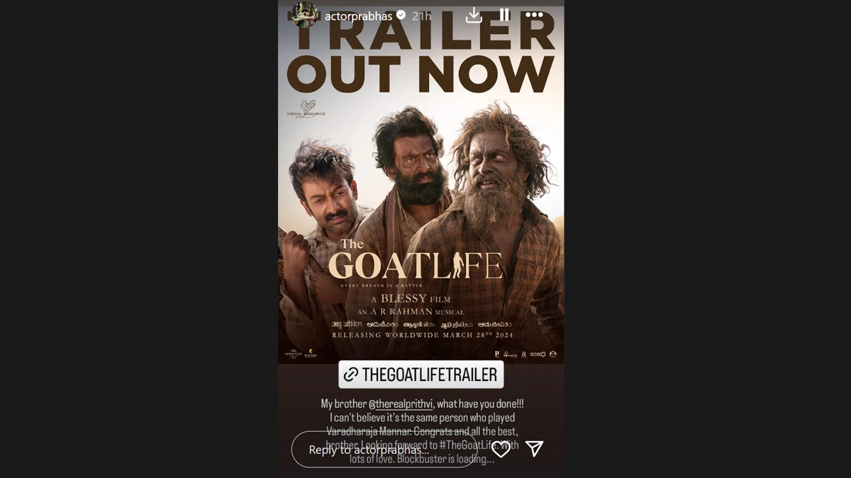 The much-awaited trailer for Prithviraj Sukumaran's Aadujeevitham was finally out on March 9, offering a glimpse into the gripping survival adventure. Prithviraj's Salaar co-star Prabhas was equally thrilled as the fans were after watching the trailer. Taking to his social media, Prabhas showered praise on the Mollywood star and wished him the very best for the upcoming film. Taking to his Instagram stories, Prabhas wrote, "My brother @realprithvi, what have you done!!! I can't believe its the same person who played Vardharaja Mannar, Congrats and all the best, brother. Looking forward to #TheGoatLife with lots of love. Blockbuster is loading." Aadujeevitham is helmed by director Blessy and is an adaptation of the acclaimed Malayalam novel of the same name. Aadujeevitham has a stellar cast that includes Amala Paul, Jimmy Jean-Louis, K.R. Gokul, Talib al Balushi, and Rik Aby. Aadujeevitham is set to hit the big screens on March 8. Aadujeevitham aka The Goat Life Trailer: Prithviraj Sukumaran's Upcoming Film Promises a Gripping Survival Adventure and Epic Cinematic Masterpiece (Watch Video).