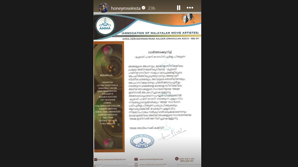 Kerala businessman Boby Chemmanur was arrested on January 8 by a Special Investigation Team (SIT) in connection with a sexual harassment complaint filed by Malayalam actress Honey Rose. Honey Rose has now shared statements from the Association of Malayalam Movie Artists (AMMA) and the Film Employees Federation of Kerala (FEFKA) Directors Union on Instagram. Both organizations have expressed solidarity with the actress. AMMA, representing Malayalam film actors, has pledged legal assistance, while FEFKA, supporting filmmakers and their teams, has commended her courage in pursuing justice. Honey Rose Controversy: Kerala Businessman Boby Chemmanur Arrested in Sexual Harassment Case Filed by Malayalam Actress.