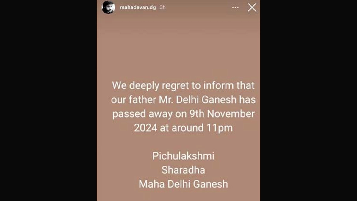 Veteran Tamil actor Delhi Ganesh is no more. He passed away due to ill health on November 9, 2024, at the age of 80. His son, Mahadevan, officially confirmed the news via his Instagram. Known for his versatile performances in over 400 films and numerous television serials, he was a beloved figure in the Tamil film industry. Some of his notable works include Sindhu Bhairavi, Nayakan and Michael Madana Kama Rajan. His last appearance was in Kamal Haasan's Indian 2. May his soul RIP. Asokan Dies at 60 After Collapsing During Live Performance; Singaporean Artiste Was Known For Impersonating Tamil Actor Sivaji Ganesan (Watch Viral Video).