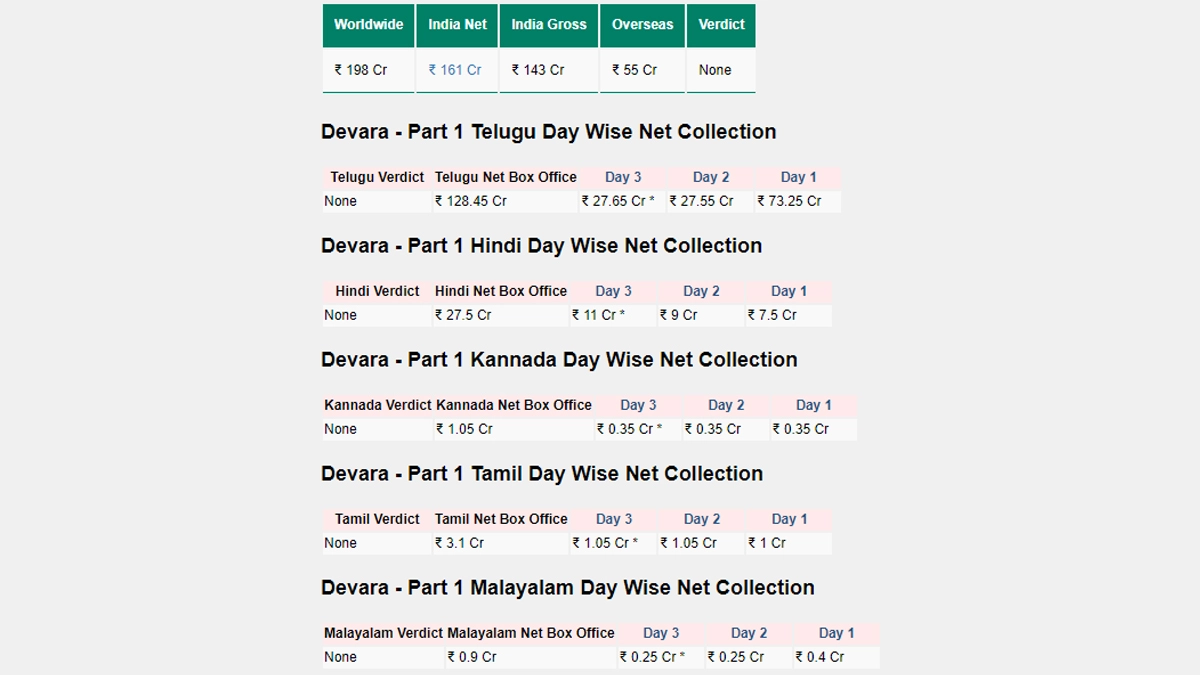 Jr NTR’s Devara: Part 1, helmed by Koratala Siva, continues to dominate the Indian box office, crossing the INR 160 crore mark within just three days of its release. According to reports from Sacnilk, the film’s Telugu version leads with a massive collection of INR 27.65 crore. Its Hindi version followed closely with INR 27.5 crore, while the Tamil version added INR 3.1 crore to the tally. The Kannada and Malayalam versions contributed INR 1.05 crore and INR 0.9 crore, respectively. The film, also starring Janhvi Kapoor and Saif Ali Khan, has reportedly grossed INR 275 crore worldwide. ‘Devara-Part 1’ Box Office Collection Day 1: Jr NTR and Janhvi Kapoor’s Action Film Gets Off to a Roaring Start, Opens With INR 172 Crore Globally!