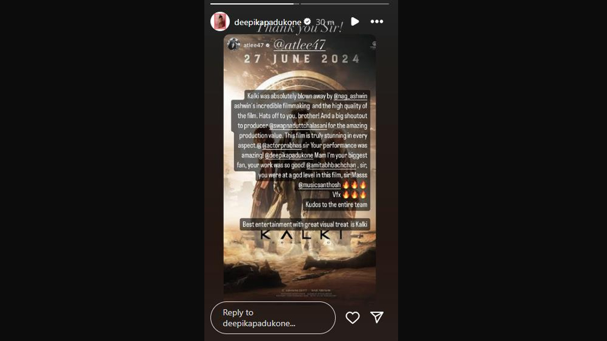 Deepika Padukone is basking in the success of her latest sci-fi film, Kalki 2898 AD, directed by Nag Ashwin. The movie has achieved critical acclaim and commercial success, earning praise from audiences and critics alike. Recently, Deepika received accolades from filmmaker Atlee, who hailed himself as her 'biggest fan'. "Prabhas sir, your performance was amazing. Deepika Padukone ma’am, I am your biggest fan, your work was so good," his post reads. Deepika acknowledged Atlee's praise by sharing his story on her Instagram and writing, “Thank you, sir!” Have a look. ‘Kalki 2898 AD’: Arjun Kapoor Reviews Prabhas and Deepika Padukone’s Mythological Sci-Fi Film, Praises Nag Ashwin’s ‘Cinematic Vision’.