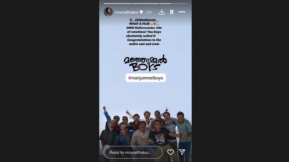 Mrunal Thakur has recently been watching a lot of Malayalam films. After watching the films, the actress also shared her opinions regarding the movies on social media. Few days back, Mrunal Thakur saw Fahad Faasil's Aavesham in theatres and called the movie a 'must watch'. On May 6, the actress shared her experience after watching Mollywood's other recent hit, Majummel Boys. Taking to her Instagram handle, the Family Star actress shared a poster of Manjummel Boys and wrote, "@chidambaram WHAT A FILM OMG Rollercoaster ride of emotions! You boys absolutely nailed it. Congratulations to the entire cast and crew." Chidambaram's Manjummel Boys, which was released in the theatres on February 22, features an ensemble cast including Soubin Shahir, Sreenath Bhasi, Ganapathi S Poduval, Balu Varghese, Lal Jr, Chandu Salimkumar, Khalid Rehaman among other in key roles. Manjummel Boys OTT Release: Netizens Praise Climax Scene and Music of Soubin Shahir–Chidambaram’s Survival Thriller!.
