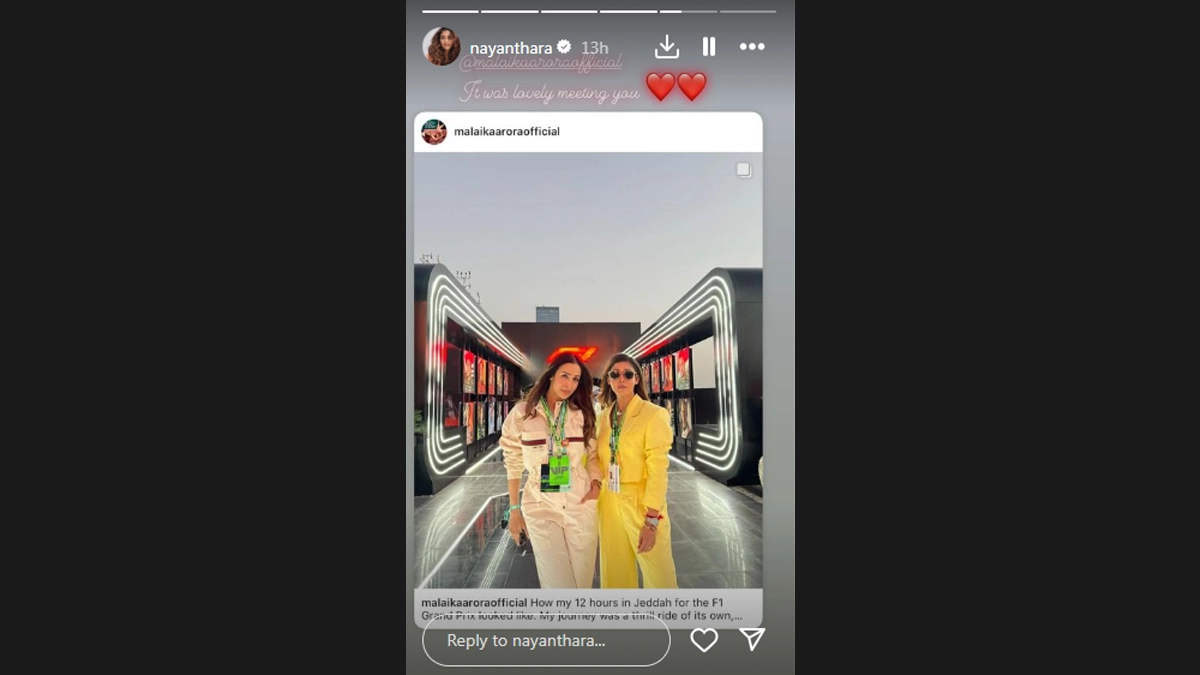 Nayanthara and Malaika Arora’s picture from the Saudi Arabian Grand Prix has taken the internet by storm. The actresses bumped into each other at the Formula One motor racing event in Jeddah, and Malaika offered glimpses of her ‘incredible experience’ at the event on social media. In the series of photos posted by her on Instagram, one picture featured her posing with Nayanthara. Nayanthara then reposted the picture on her Instagram Story, captioning it, “It was lovely meeting you”. Nayanthara-Vignesh Shivan Spend Quality Time in Saudi Arabia; Couple Seen Walking Hand-in-Hand Amid Separation Rumours (View Pic).