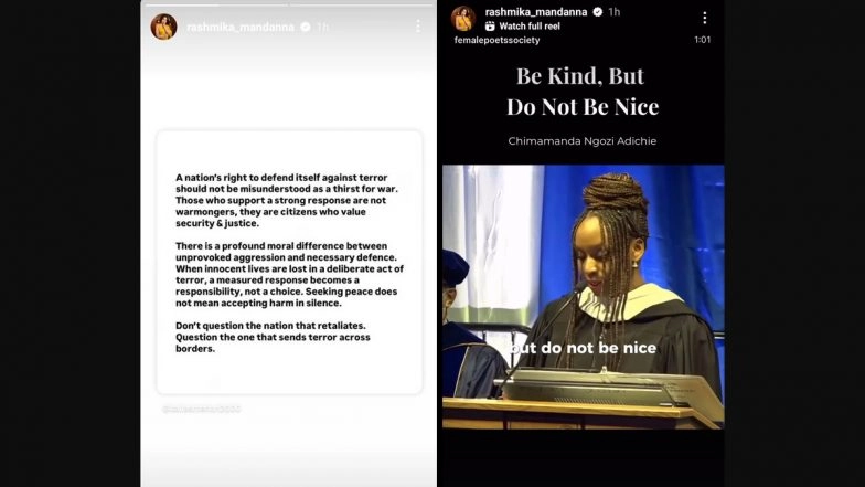 The Indian Armed Forces recently launched Operation Sindoor to destroy terrorist infrastructure in Pakistan and Pakistan-occupied Jammu and Kashmir. In response to this, Pakistan targeted multiple locations across the border at areas including Satwari, Samba, RS Pura and Arnia. According to defence sources, the attacks were repelled with zero casualties as India's air defence systems successfully intercepted them. Amid, Rashmika Mandanna has come forward with her support for the army through posts on social media. Taking to her Instagram stories, the Pushpa 2 star re-shared a post that talked about the moral difference between unprovoked aggression and necessary defence. Her post read, "Seeking peace does not mean accepting harm in silence". In another story, she reshared a video of Nigerian author Chimamanda Ngozi Adichie, who spoke about how being nice doesn't always help make the world a better place. The video was captioned, "Be kind, but do not be nice". ‘Jai Hind!’: Shraddha Kapoor, Kangana Ranaut, Anupam Kher, Vir Das and Other Celebrities Salute the Armed Forces Amid India-Pakistan Conflict (See Posts).