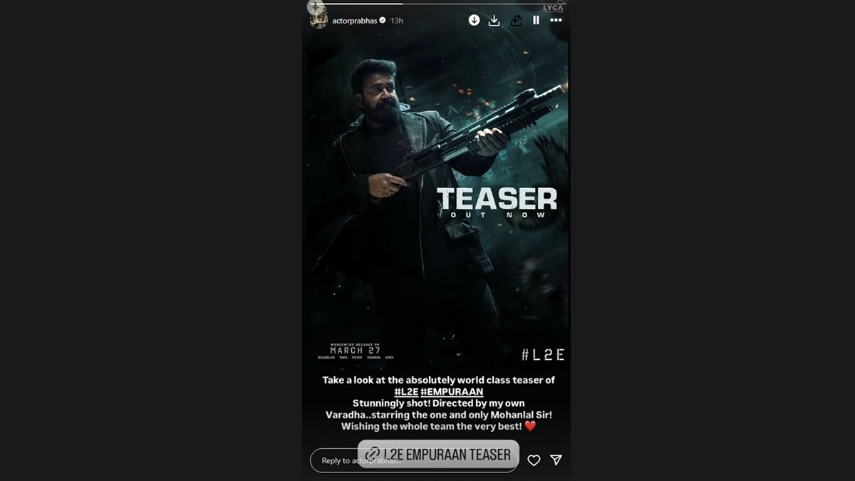 The teaser of L2: Empuraan, also known as L2E, has left fans and movie enthusiasts impressed. Even Prabhas can’t stop raving about the teaser for the highly anticipated Lucifer sequel. Taking to his Insta Story, Prabhas praised the teaser as ‘world class’ and highlighted the film’s breathtaking visuals, noting how it has been ‘stunningly shot’ under the direction of Prithviraj Sukumaran. The actor wrapped up his message by extending his best wishes to the entire L2E team. Starring Mohanlal in the lead role, the film is slated for a theatrical release on March 27. Prithviraj Sukumaran Confirms Mohanlal-Starrer ‘L2: Empuraan’ as a ‘Standalone Film’, Drops Hints About ‘Lucifer Part Three’.
