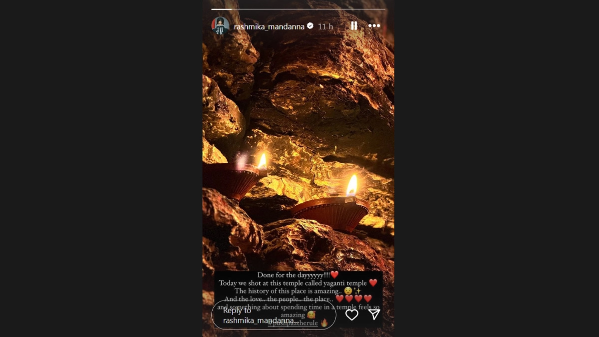 Rashmika Mandanna is currently busy shooting for her next film, Pushpa 2: The Rule. The actress is known for constantly updating fans with her personal and professional life is back with another big sneak peek from the sets of her upcoming film. On March 19, the actress took to her Instagram handle and shared a picture from Yaganti Temple in Andhra Pradesh from the shoot of Pushpa 2: The Rule. Sharing the picture, Rashmika wrote, "Done for the day! Today, we shot at this temple called Yaganti temple. The history of the place is amazing..And the love.. the people..the place.. and something about spending time in a temple feels so amazing. #pushpa2therule" Sukumar's Pushpa 2: The Rule, starring Allu Arjun and Rashmika Mandanna, will be released in the theatres on August 15, 2024. Pushpa 2 – The Rule: Rashmika Mandanna’s LOOK As Srivalli Leaked! Check Out Viral Picture of the Actress From Sets of Allu Arjun and Sukumar’s Film.