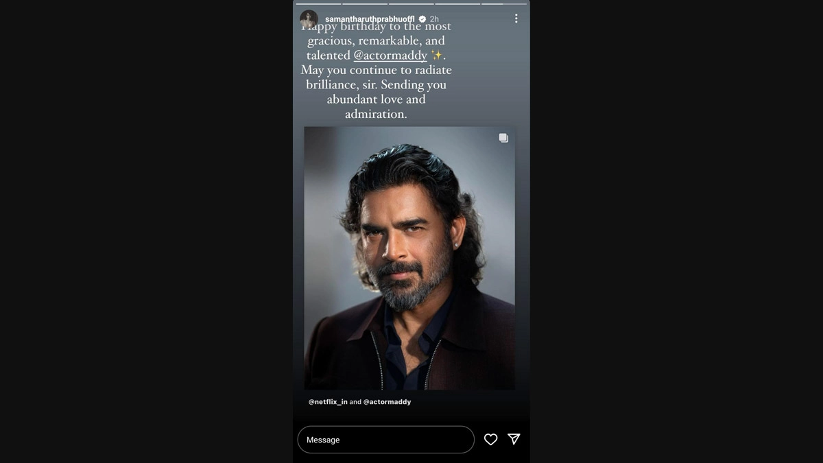 Samantha Ruth Prabhu took to her Instagram handle to mark R Madhavan's 54th birthday on June 1 with a heartfelt tribute. In her message, Samantha didn't merely extend birthday wishes; she crafted a narrative of reverence, celebrating Madhavan's grace, talent, and remarkable presence in the realm of Indian cinema. She wrote, “Happy birthday to the most gracious, remarkable, and talented @actormaddy”. Her words were a testament to the profound impact Madhavan had, not just on screens but in the hearts of countless fans. R Madhavan Birthday: From 3 Idiots to Shaitaan, 5 Films of the Heartthrob That Fans Can Enjoy Watching Online!.