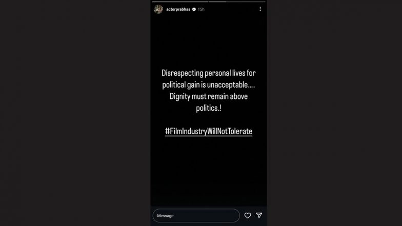 The Telugu film industry has come together to respond to the shocking allegations made by Telangana minister Konda Surekha, which suggest political interference in the divorce of Samantha Ruth Prabhu and Naga Chaitanya. Prominent actors, including Prabhas and Ram Charan, have strongly rejected Surekha’s unfounded claims. Prabhas voiced his concerns in an Instagram story, stressing the need for dignity, while Ram Charan took to X (formerly known as Twitter) to describe Surekha’s remarks as ‘irresponsible’ and ‘baseless.’ The industry’s key figures have banded together to dismiss these inflammatory statements, emphasising the need for respect and decorum during this challenging period. This unified response highlights a collective stand against inappropriate political involvement in the personal lives of those within the film community. Samantha Ruth Prabhu-Naga Chaitanya Divorce: Teja Sajja Slams Telangana Minister Konda Surekha for Her ‘Shallow Opinion on Actors’.