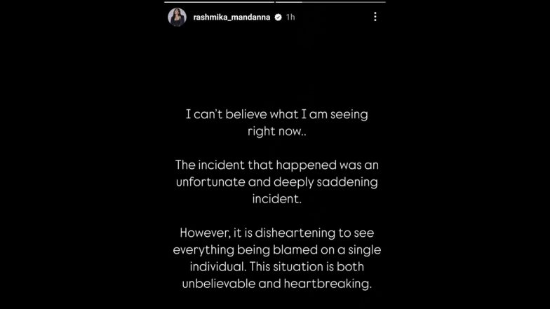 The Telangana High Court on Friday (December 13) granted interim bail of four weeks to Telugu superstar Allu Arjun in connection with the stampede outside the Sandhya Theatre in Hyderabad on December 4, causing the death of a 35-year-old woman. The sensational arrest of Allu Arjun drew mixed reactions from fans who believed that he had no connection with the tragic incident. Now, Allu Arjun's Pushpa 2: The Rule Rashmika Mandanna has expressed her shock over the whole matter on her social media handle. She wrote, "I can't believe what I am seeing right now. The incident that happened was unfortunate and deeply saddening. However, it is disheartening to see everything being blamed on a single individual. This situation is both unbelievable and heartbreaking." Allu Arjun Granted Interim Bail by Telangana Hight Court in ‘Pushpa 2’ Premiere Stampede and Death Case.