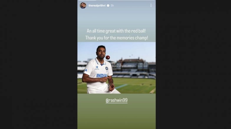 Renowned Indian cricketer Ravichandran Ashwin has announced his retirement from international cricket. The star all-rounder made the announcement after India vs Australia's third test match in Brisbane on Wednesday, December 18. Though R Ashwin did not participate in the match, he took the opportunity to make the announcement. Upon news of his retirement, the cricketing community, fans and admirers of the game bid their goodbye to the player. Malayalam star Prithviraj Skukumaran also reacted to R Ashwin's retirement. Taking to his Instagram stories, the L2: Empuraan actor shared a picture of the cricketer and wrote, "An all-time great with the red ball! Thank you for the memories champ!" Ravi Ashwin Retires: Sunil Gavaskar Criticises Timing of Indian Off-Spinner’s Retirement, Says ‘The Spinner Left India One Short’.