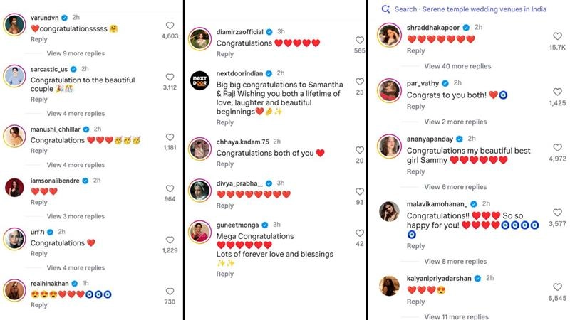 Actress Samantha Ruth Prabhu is officially married! The Family Man 2 star surprised fans by sharing pictures from her intimate wedding ceremony with filmmaker Raj Nidimoru on Instagram. Posting a series of photos on Monday afternoon, she captioned them with the date “01.12.2025” and white heart emojis. The ceremony was simple yet elegant, held before Linga Bhairavi, where Raj was seen placing a ring on Samantha’s finger. Another frame showed Samantha holding him close, proudly flaunting her engagement ring, while the final picture captured their radiant smiles as they walked through a flower-adorned doorway. Celebrities showered the couple with love, including Shraddha Kapoor, Ananya Panday, Kalyani Priyadarshan, Malavika Mohanan, Dia Mirza, Hina Khan, Uorfi Javed, Parvathy, Sonali Bendre, Guneet Monga, Divya Prabha and Manushi Chhillar. Surprisingly, only Varun Dhawan, Samantha’s Citadel co-star, represented the male brigade in the congratulatory list. Samantha Ruth Prabhu and Raj Nidimoru Get Married in Traditional Wedding in Coimbatore; Anupama Parameswaran, Nimrat Kaur and Other Celebs Send Love to the Newlyweds.