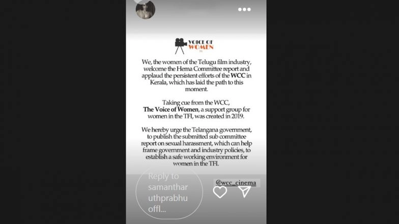 After a detailed report issued by the Justice Hema Committee, many big names from the Malayalam film fraternity have been called out for sexual assault and misconduct by female artistes. Amid this, actress Samantha Ruth Prabhu has urged the Telangana government to publish a similar report requesting support for women in the Telugu industry. Taking to her Instagram stories on Friday, the actress lauded the efforts of the Women in Cinema Collective (WCC) in Kerala and the Voice of Women for raising voices against sexual harassment in the industry. She wrote, "We, the women of Telugu industry, welcome the Hema Committee report and applaud the persistent efforts of the WCC in Kerala, which has laid the path to this moment. Taking cue from the WCC, The Voice of Women, a support group for women in the TFI was created in 2019." The actress then requested the Telangana government to publish the submitted sub-report, which will help create various policies, thereby creating a safer and better work environment for women. Sandhya Mridul on How Social Media and the ‘Me Too’ Movement Have Changed Industry Dynamics; Actress Says, ‘Women Are Now Confident in Speaking Out Against Sexual Harassment’.
