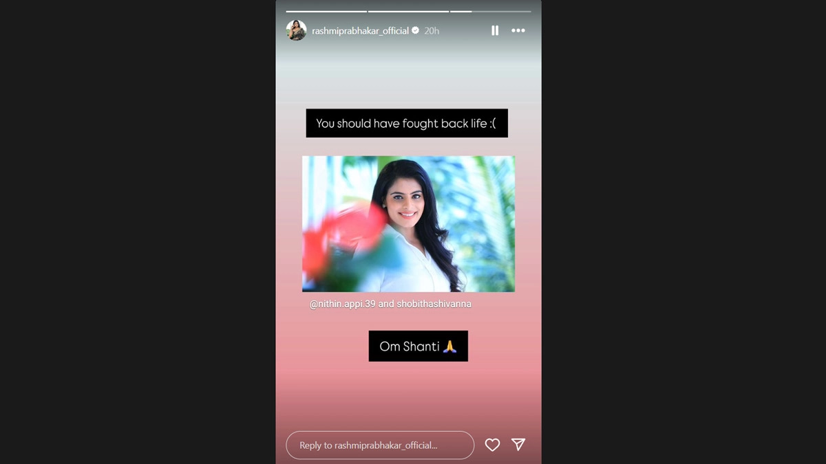 Kannada actress Shobitha Shivanna was found dead in her apartment in Hyderabad's Kondapur. The authorities suspect that she died by suicide, but the exact cause of her tragic death remains unclear. An investigation is currently underway. Following the news, several celebrities, including Geetha Bharathi Bhat and Chandu Gowda, expressed their grief and paid tribute to the late actress. The industry and her fans are in shock over the untimely loss of Shobitha Shivanna, who was beloved by many. FYI, Shivanna was known for her works in movies like Eradondla Mooru, ATM and more. Kannada Actress Shobitha Shivanna Passes Away: Police Suspect Suicide, Investigation Underway.