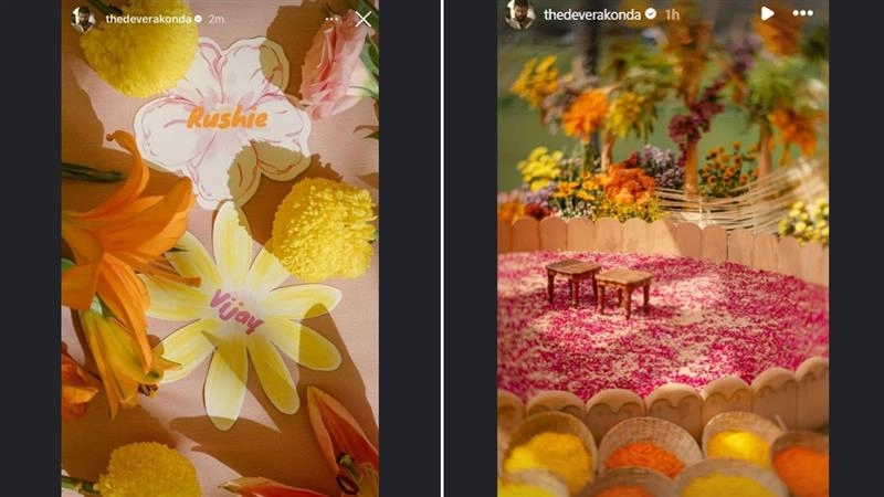 Vijay Deverakonda has given fans a charming sneak peek into his haldi celebrations with Rashmika Mandanna. Taking to Instagram Stories, the actor shared glimpses of the beautifully designed venue, blending tradition with personal details. The outdoor setup featured a circular space lined with soft wooden panels and covered in delicate pink rose petals. Two small wooden stools were placed at the centre for the couple’s ritual. Baskets filled with bright marigold petals added a festive touch. What truly caught attention were the personalised floral name cards one reading “Rushie,” Rashmika’s sweet nickname, and the other “Vijay.” The couple will marry on February 26 in Udaipur with two traditional ceremonies planned. ‘Virosh’ Wedding: Tamannaah Bhatia Sends Sweet Wishes to Bride-To-Be Rashmika Mandanna Ahead of D-Day With Vijay Deverakonda (Watch Video).