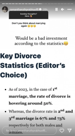 Actress Samantha Ruth Prabhu, on Sunday, engaged in an 'Ask Me' session on Instagram, where she candidly responded to various queries from her fans. One particularly interesting question came from a fan inquiring about her perspective on second marriage. In a witty response, Samantha shared divorce statistics for the year 2023, adding a satirical touch. She humorously commented, “According to the stats, it might not be the best investment choice," accompanying the statement with the following divorce rates. For the unversed, Samantha tied the knot with Naga Chaitanya in 2017. The couple announced their separation in October 2021. Samantha Ruth Prabhu Takes Break From Work! Actress' Hairstylist Pens Heartwarming Note After She Goes on 'Healing Journey' (View Pics).